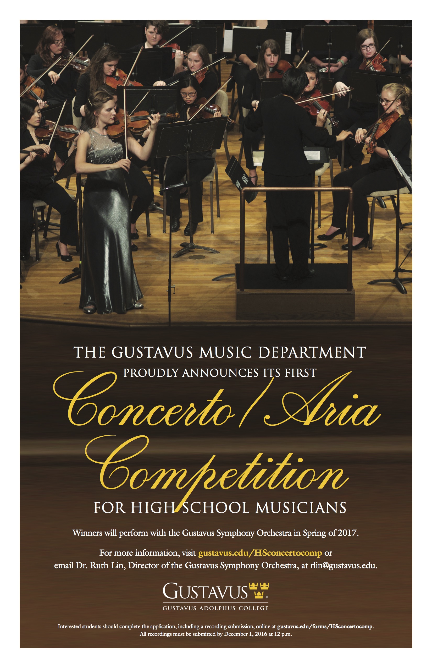 The Department of Music at Gustavus Adolphus College is pleased to announce the first Concerto/Aria Competition for high school musicians. The competition is open to instrumentalists and vocalists in high school (9-12) who are currently taking lessons. The winner of the competition will receive a Music Scholarship at Gustavus and will perform with the Gustavus Symphony Orchestra, conducted by Ruth Lin, in Jussi Björling Recital Hall on Saturday, April 22 at 1:30. Audition recordings must be submitted by December 1 along with application materials found at: 2017 Gustavus Concerto/Aria Competition.
